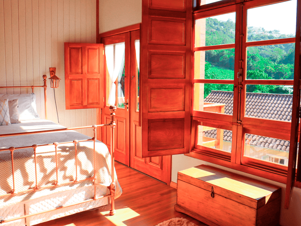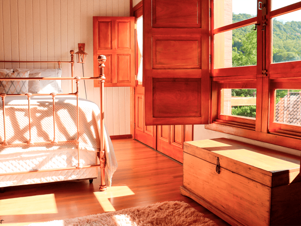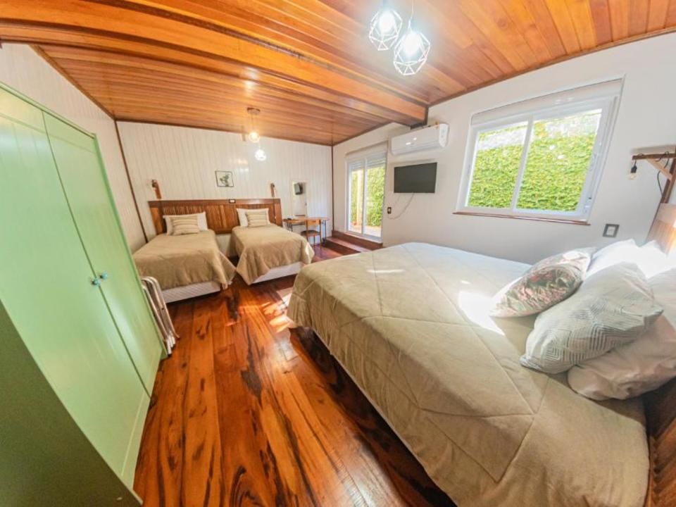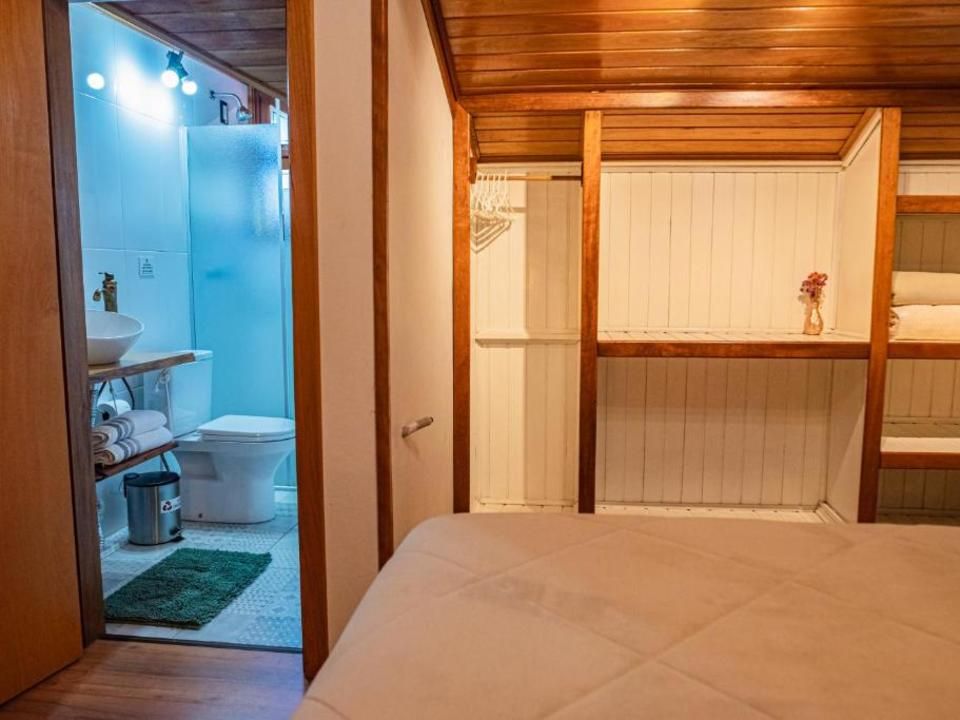 Suíte térrea aconchegante e rústica com jardim de inverno, ideal para você descansar após um passeio pelo Vale dos Vinhedos. Para o seu conforto, conta com ar-condicionado (quente e frio), TV de tela plana com Netflix, mesa de trabalho e banheiro com aquecimento no chuveiro e torneiras. Acomoda até 4 pessoas, uma opção para famílias com crianças e grupos.