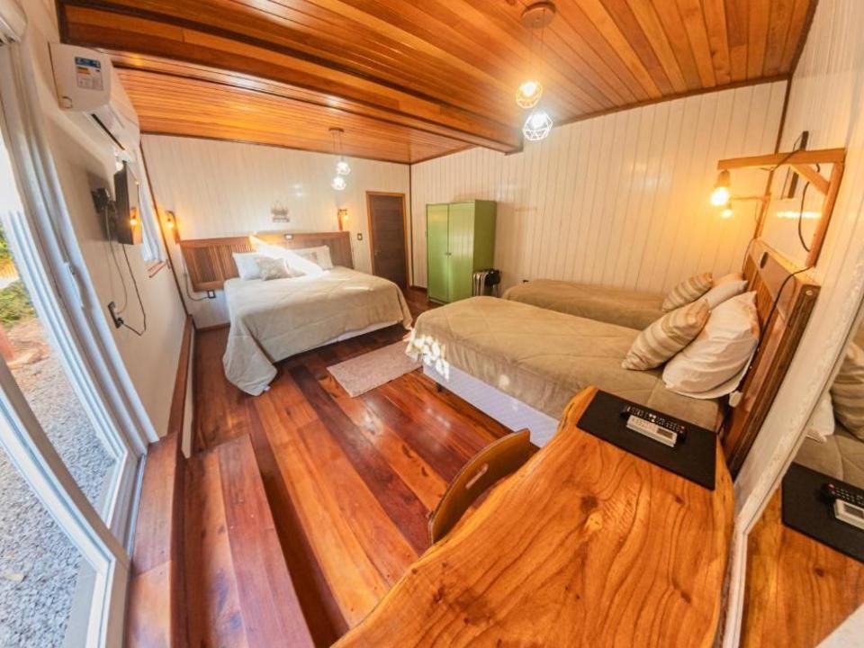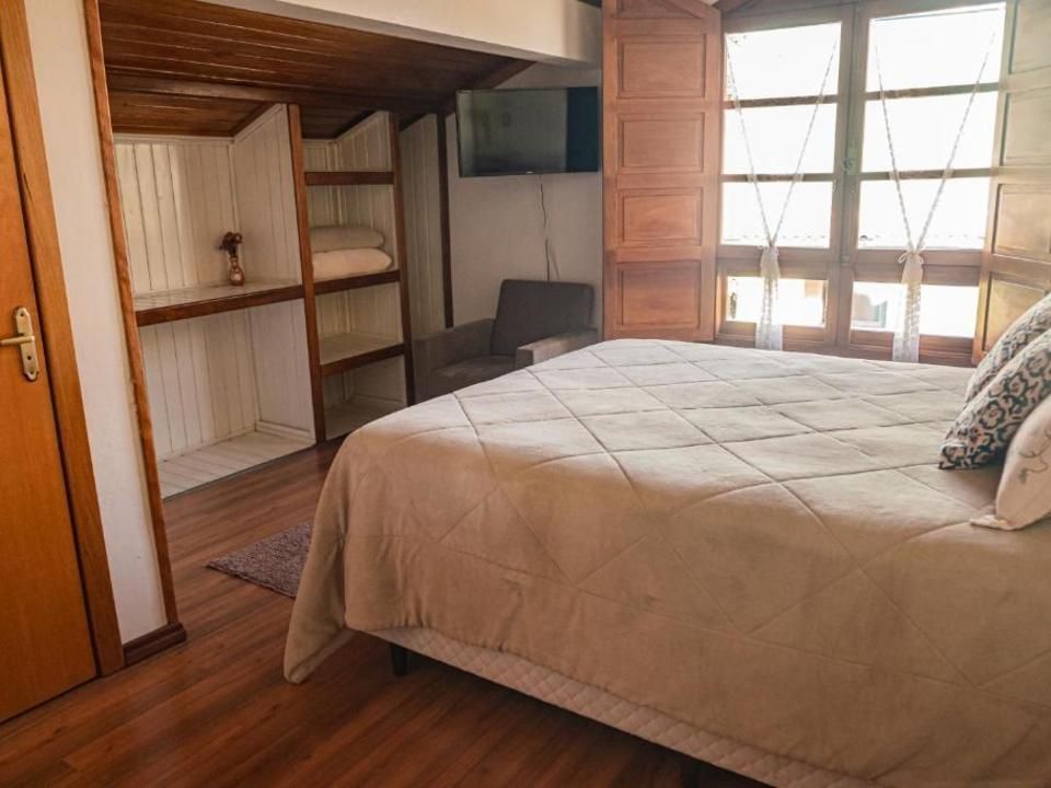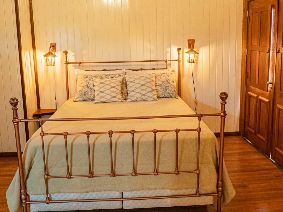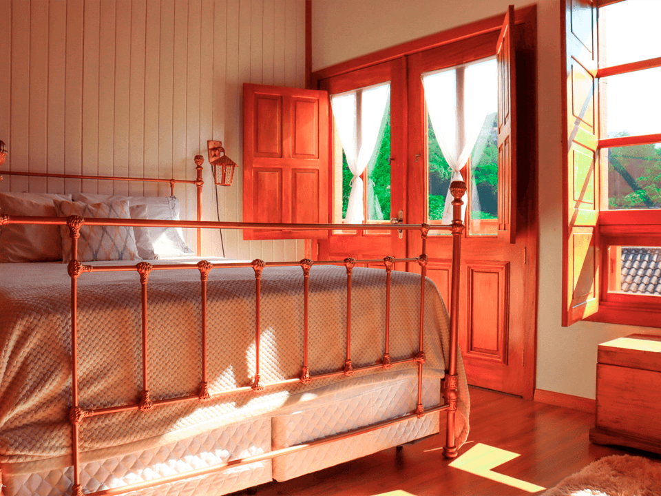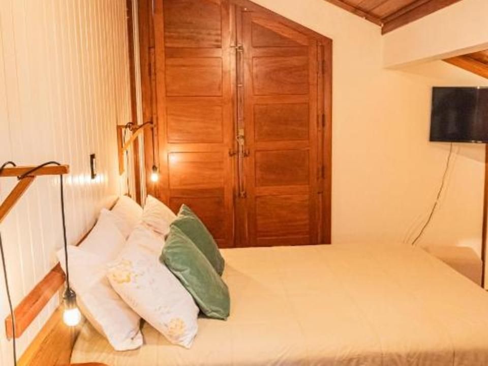 Suíte térrea aconchegante e rústica com jardim de inverno, ideal para você descansar após um passeio pelo Vale dos Vinhedos. Para o seu conforto, conta com ar-condicionado (quente e frio), TV de tela plana com Netflix, mesa de trabalho e banheiro com aquecimento no chuveiro e torneiras. Acomoda até 4 pessoas, uma opção para famílias com crianças e grupos.