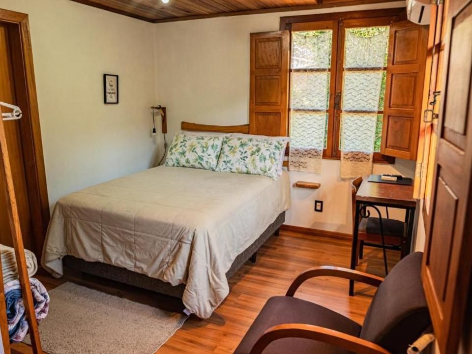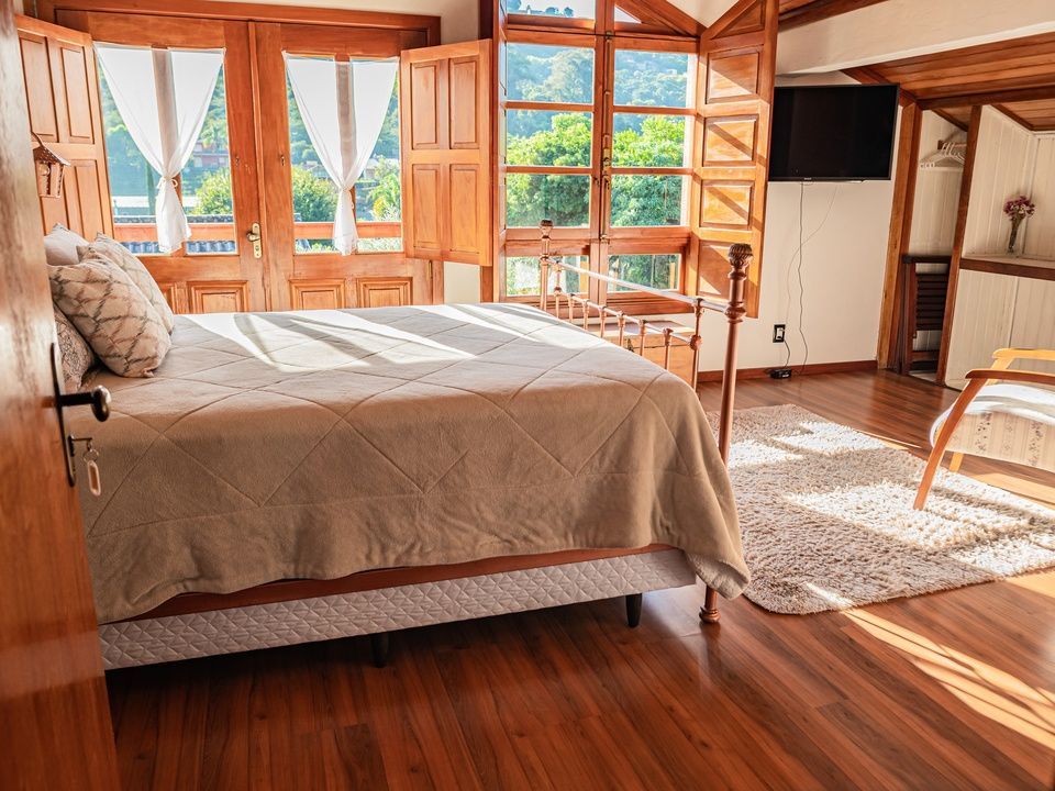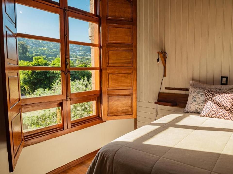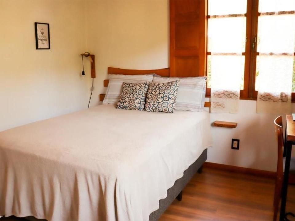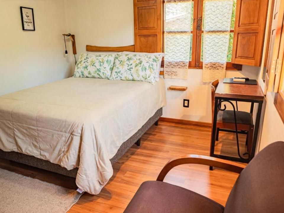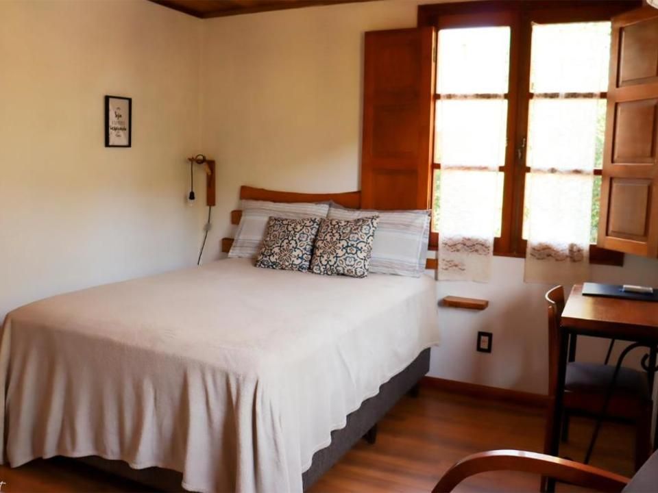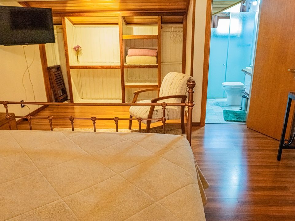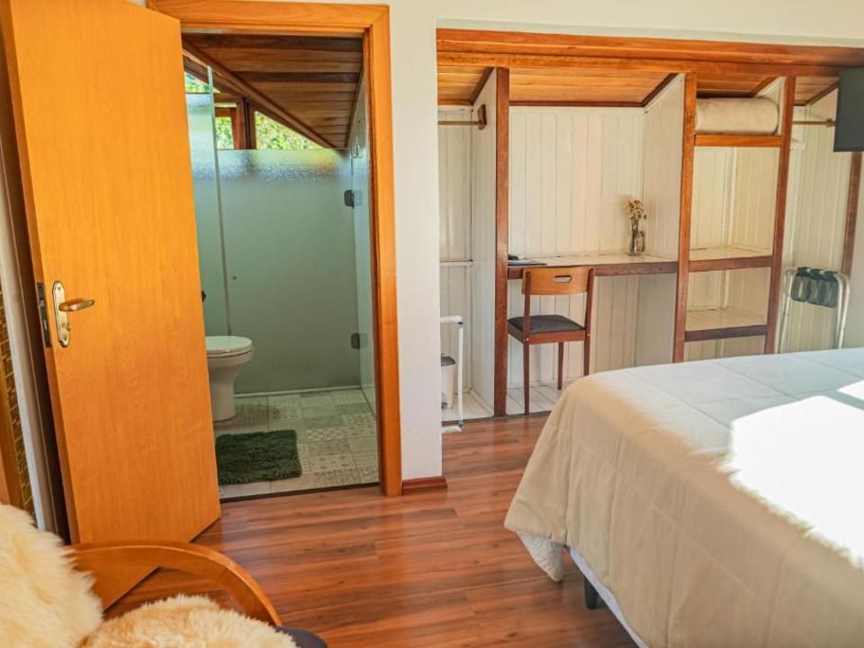 Suíte aconchegante e rústica com vista privilegiada para natureza e vinhedos, ideal para você descansar após um passeio pelo Vale dos Vinhedos. Para o seu conforto, conta com ar-condicionado (quente e frio), TV de tela plana com Netflix, cama de casal, mesa de trabalho e banheiro com aquecimento no chuveiro e torneiras.
