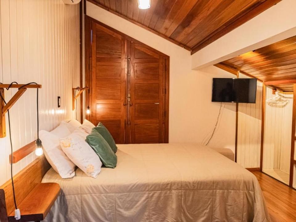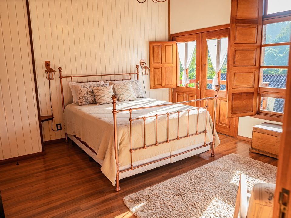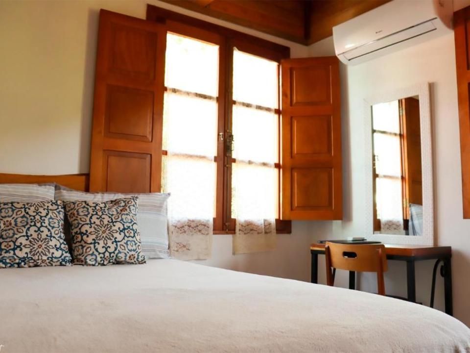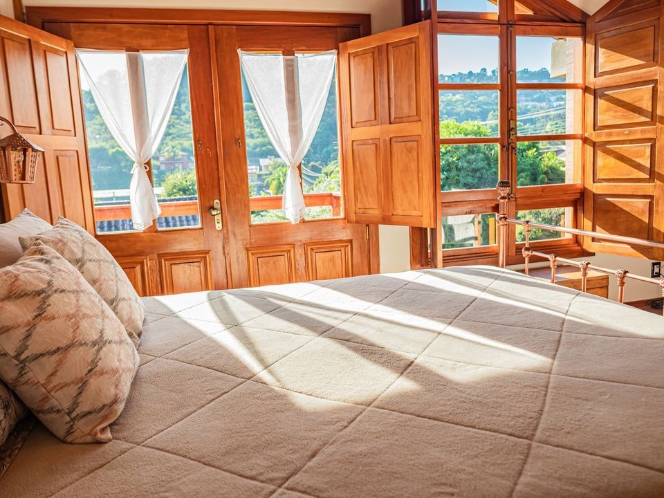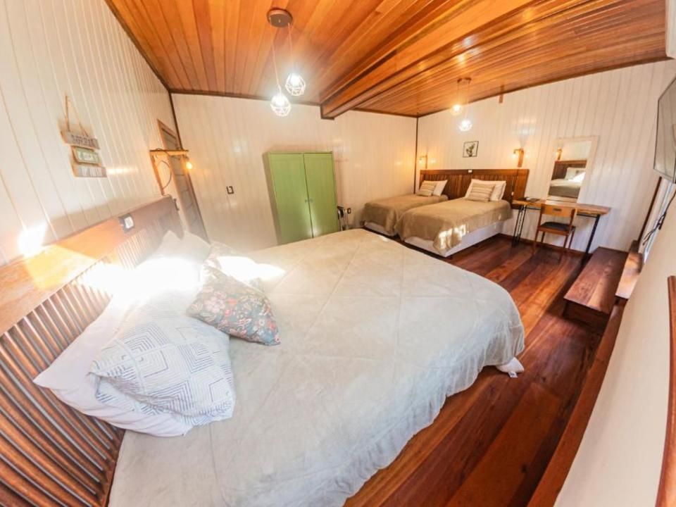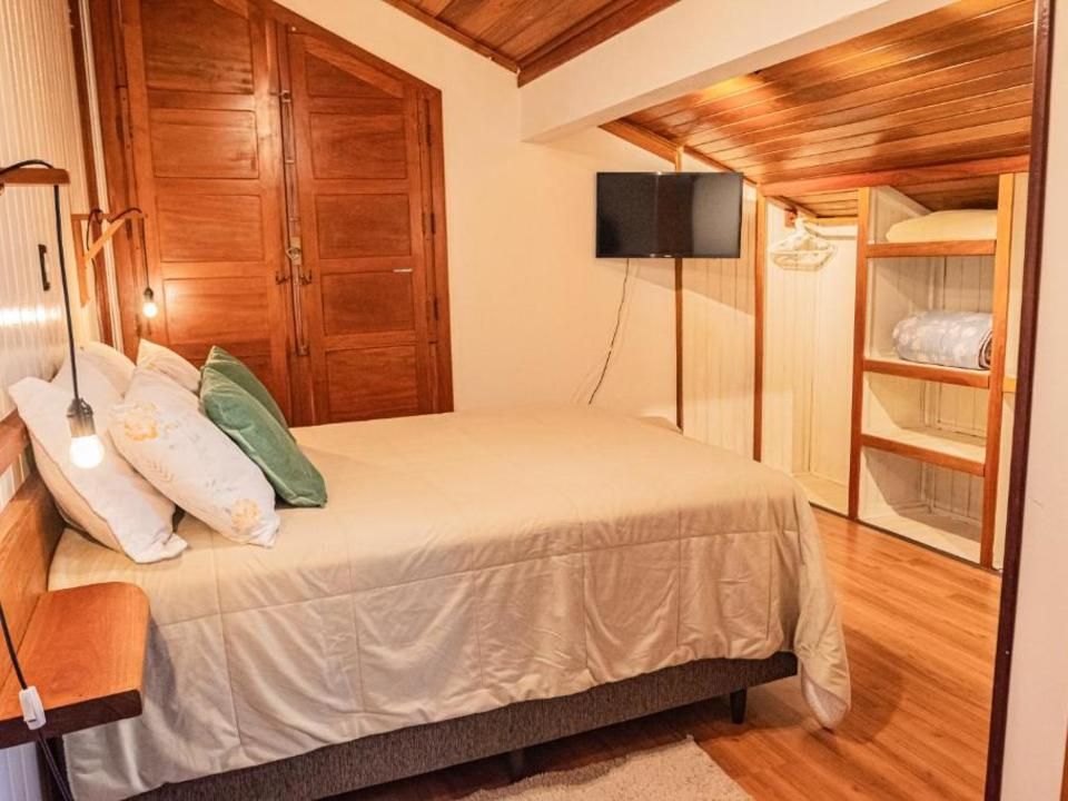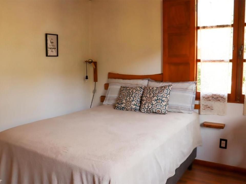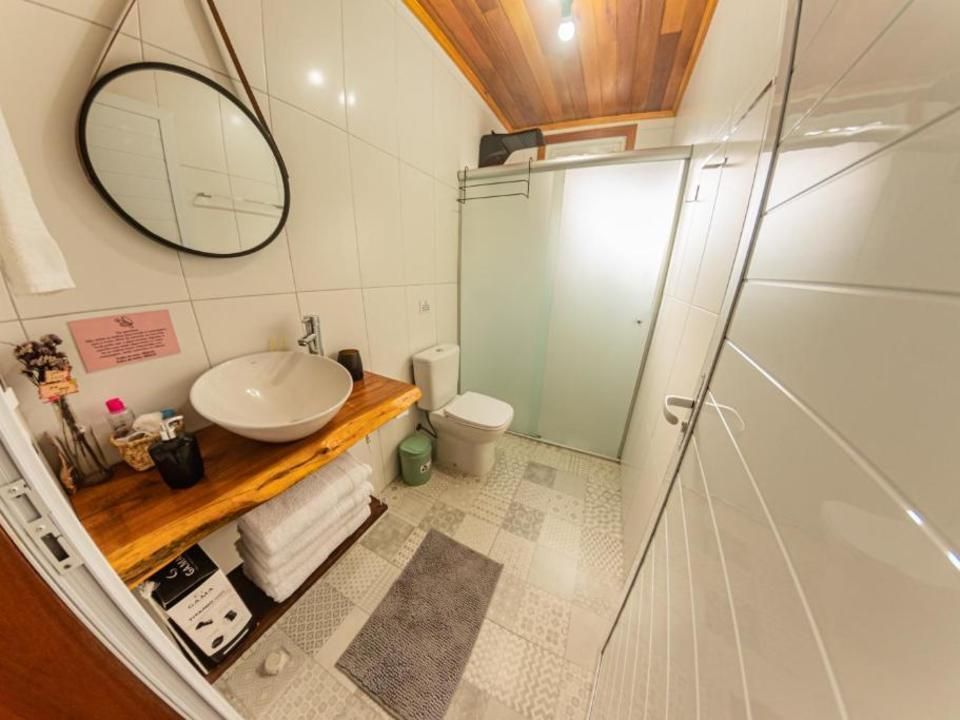 Suíte aconchegante e rústica com vista privilegiada para natureza e vinhedos, ideal para você descansar após um passeio pelo Vale dos Vinhedos. Para o seu conforto, conta com ar-condicionado (quente e frio), TV de tela plana com Netflix, cama de casal, mesa de trabalho e banheiro com aquecimento no chuveiro e torneiras.