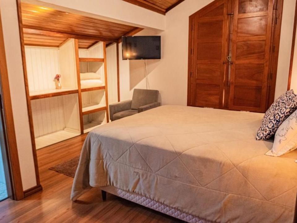 Suíte aconchegante e rústica, ideal para você descansar após um passeio pelo Vale dos Vinhedos. Para o seu conforto, conta com ar-condicionado (quente e frio), TV de tela plana com Netflix, cama de casal, mesa de trabalho e banheiro com aquecimento no chuveiro e torneiras.